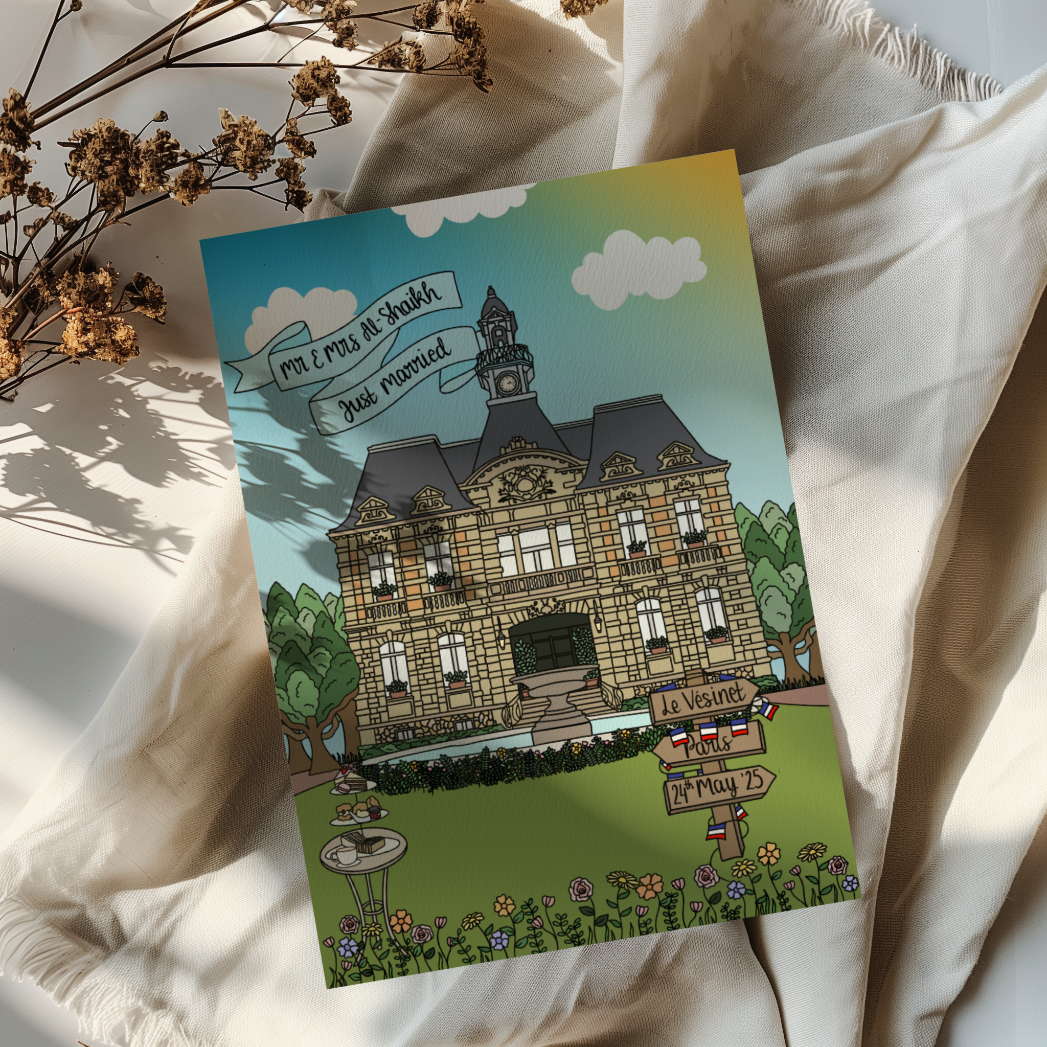 Let me know your names, date, venue info and any small changes you'd like (e.g. bunting colour, signage style, sky tone, etc.).